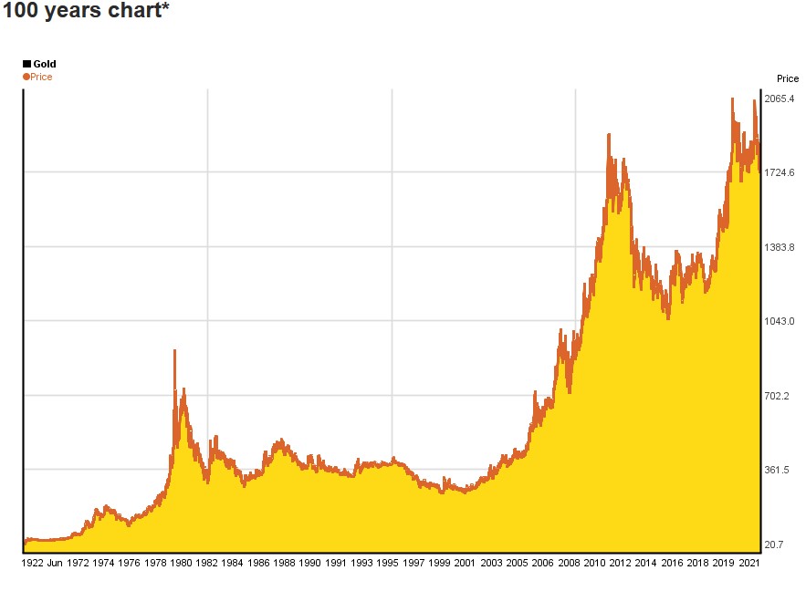 See the last 100 years of gold pricing from the gold chart below.